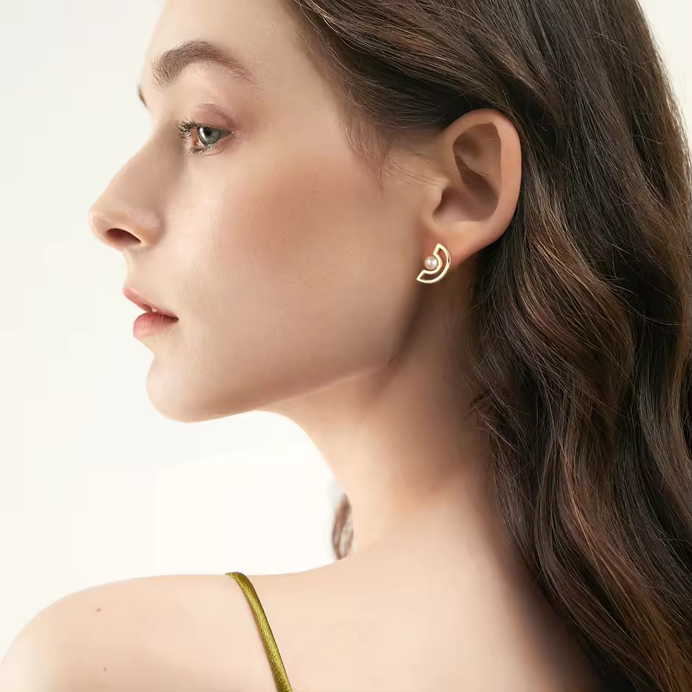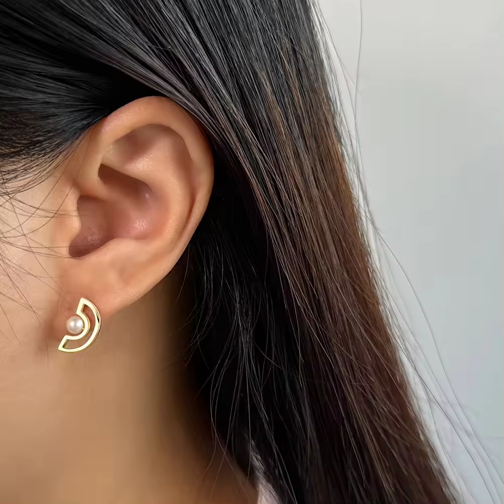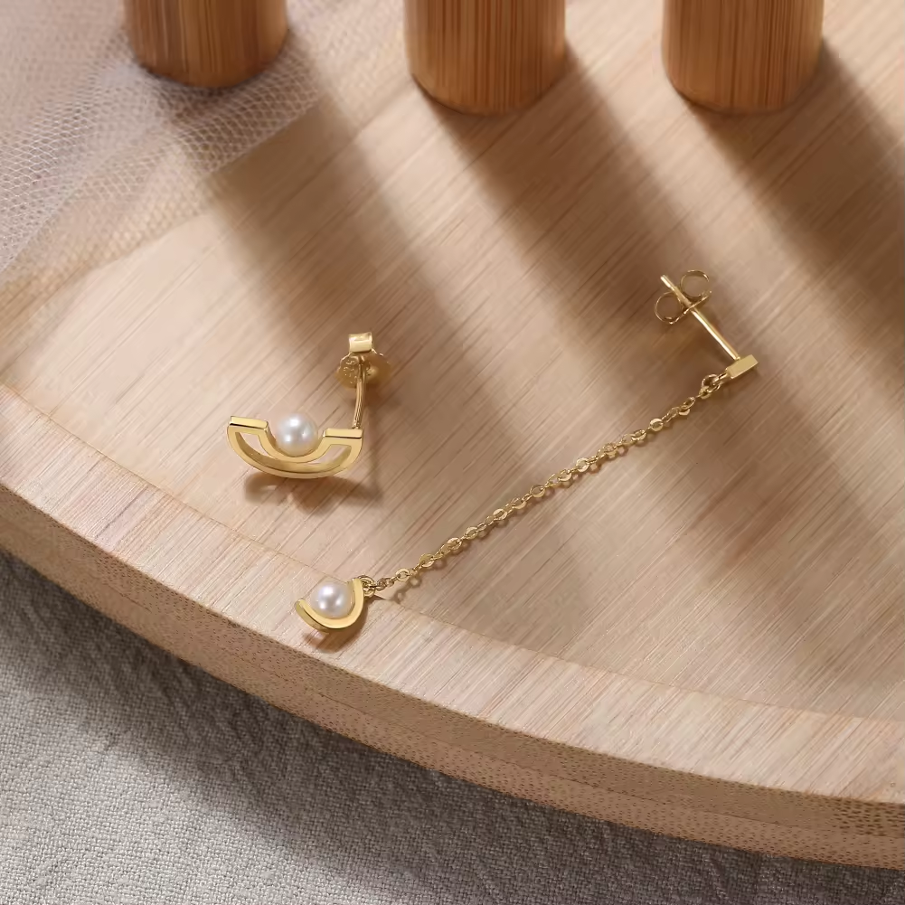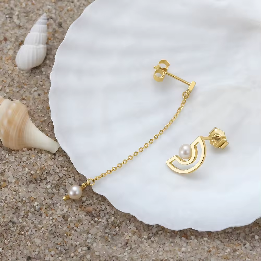 Entdecken Sie die einzigartige Eleganz unserer handgefertigten minimalistischen asymmetrischen Ohrringe, die eine harmonische Kombination aus einem Halbcreis-Ohrstecker mit Perle und einer Perlenkette darstellen. Jedes Paar dieser exquisiten Ohrringe wird mit größter Sorgfalt aus hochwertigem 925 Sterling Silber gefertigt und anschließend mit einer luxuriösen 14K Goldplattierung veredelt.