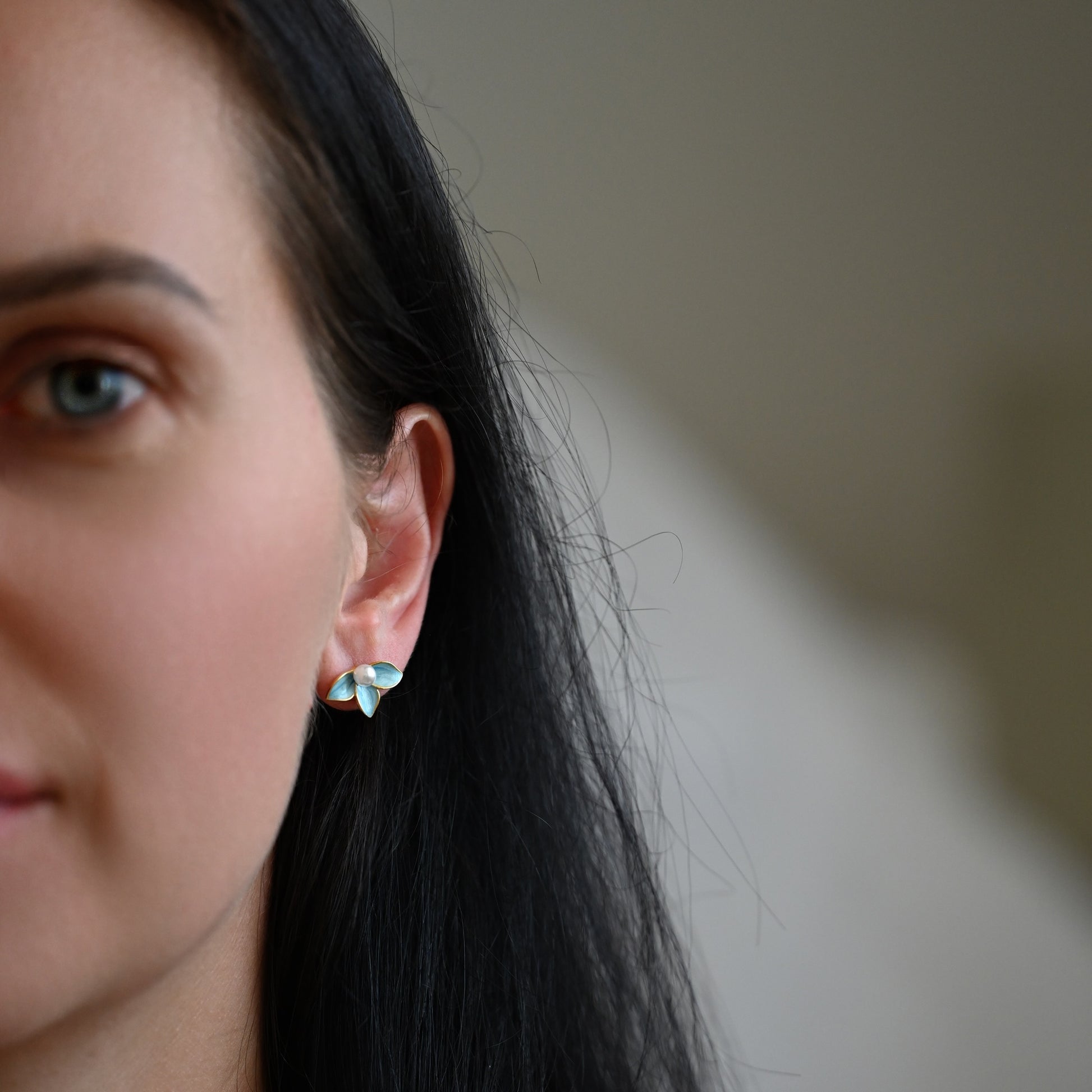 Jedes Paar dieser Ohrringe ist aus hochwertigem 925 Sterling Silber gefertigt und sorgfältig blau emailliert, um die zarten Details der Blume hervorzuheben. In der Mitte der Blüte befindet sich eine kleine Perle, die einen Hauch von Glanz und Raffinesse verleiht.