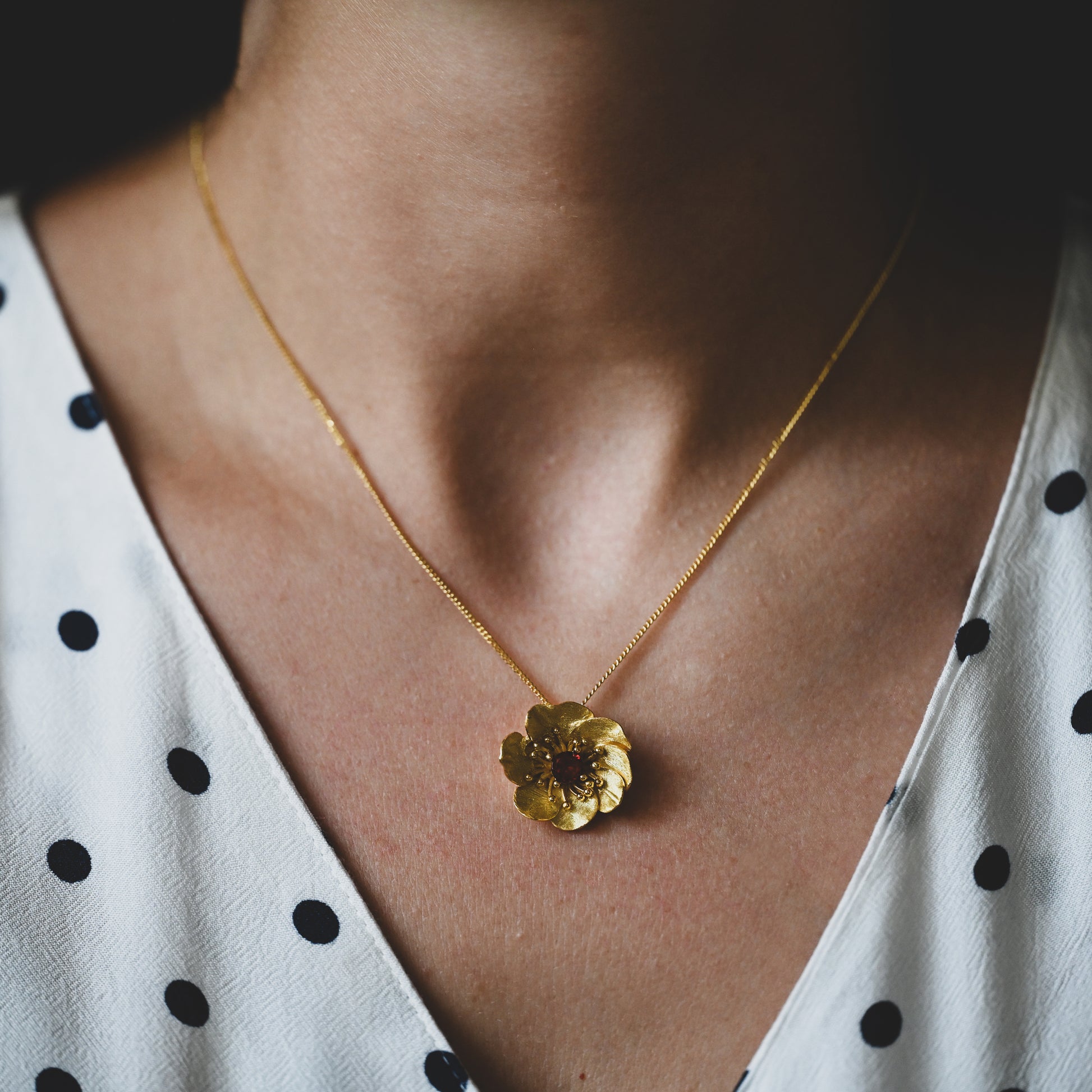 Handgefertigte Kette mit großer Anemone Blume, 925 Sterling Silber, 18K Gold, mit natürlichem Granat