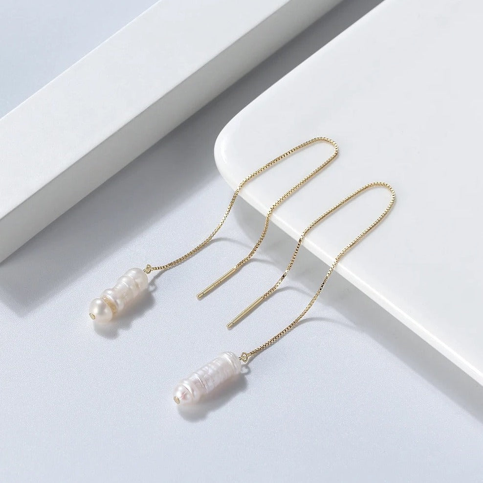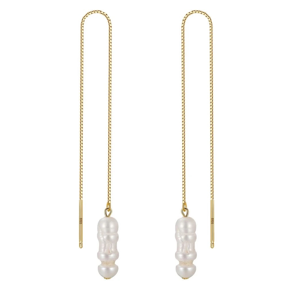Die Kettenohrringe präsentieren eine einzigartige Kollektion von natürlichen Süßwasserperlen in unregelmäßigen Barockformen, die jeder Perle ihr eigenes einzigartiges Aussehen verleihen. Jede Perle ist ein Unikat, und während wir für jedes Paar ähnliche Perlen suchen, sind sie nicht identisch, was jedem Schmuckstück eine besondere Note verleiht.