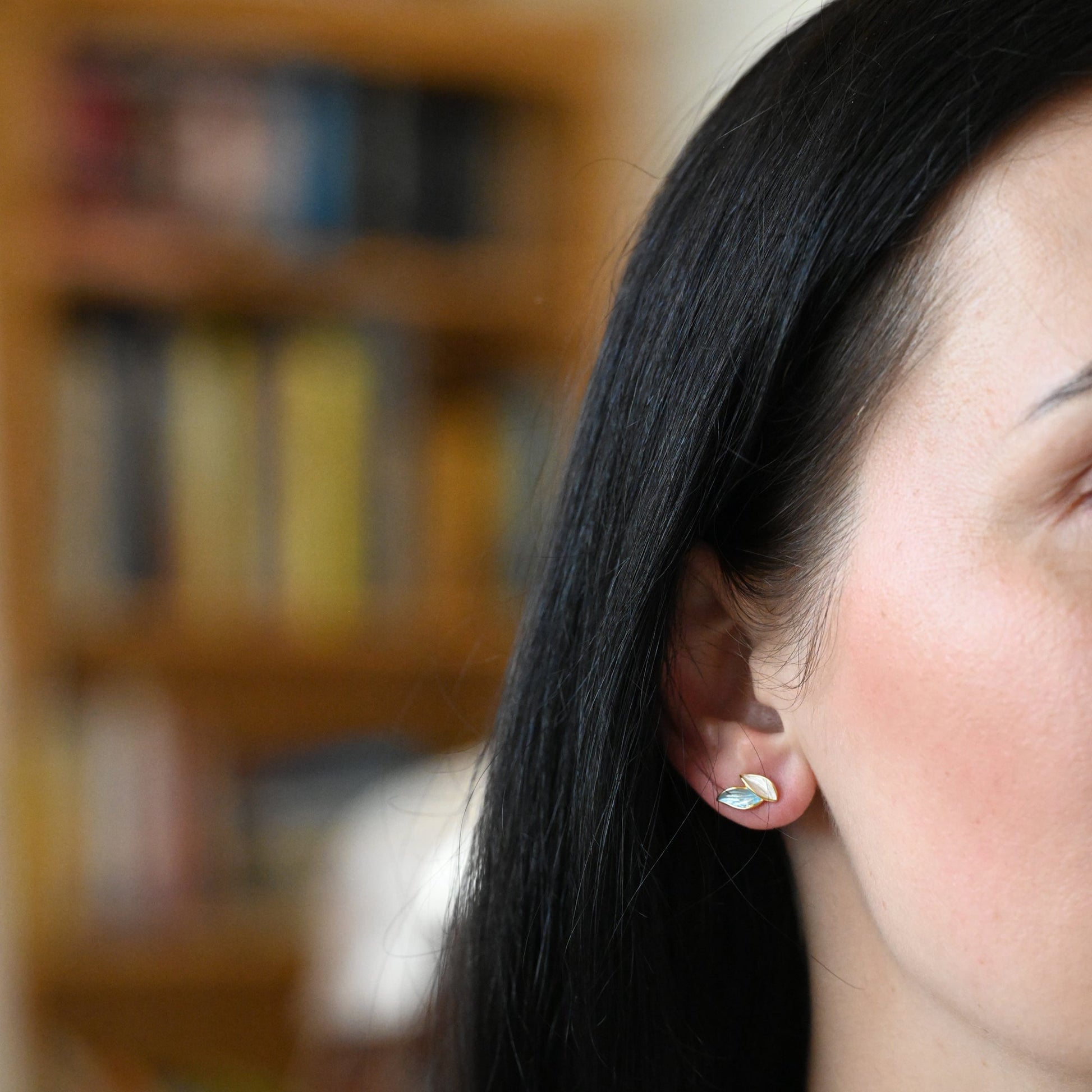 Entdecken Sie die subtile Eleganz der Natur mit unseren zarten handgefertigten Ohrsteckern, die zwei kleine Blätter präsentieren – eins in einem zarten Blauton und das andere in einem sanften Grau mit einer Perlmutt-Note. Diese kunstvollen Ohrstecker sind eine Hommage an die Schönheit der Natur und verleihen Ihrem Look eine dezente Raffinesse.